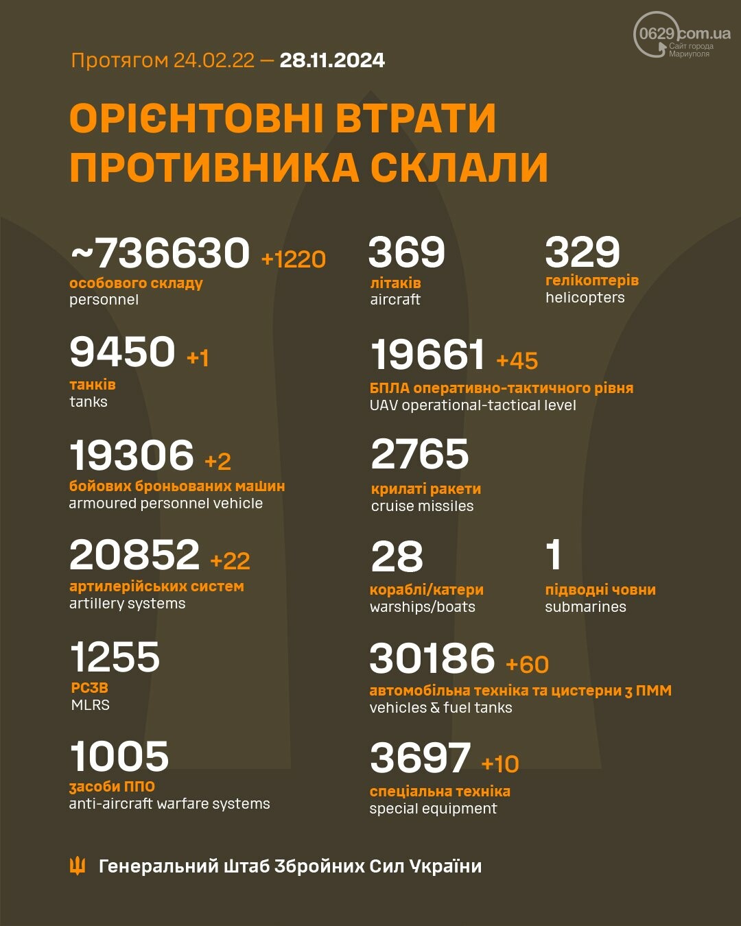 В общей сложности, за прошедшие сутки потери российских захватчиков составили 1220 человек. Также украинские воины обезвредили танк, две боевые бронированные машины, 22 артиллерийские системы, 45 БПЛА оперативно-тактического уровня, 60 единиц автомобильной и 10 единиц специальной техники окупантов.
