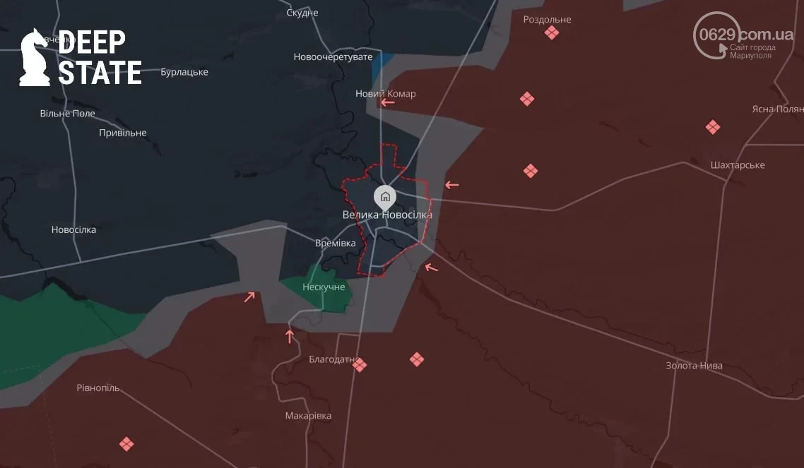 Войска РФ пытаются двигаться в сторону трассы из Гуляйполя в поселок Великая Новоселка. Наиболее активные бои в районе поселка продолжаются в районе населенных пунктов Новый Комар и Нескучное, сообщают аналитики проекта DeepState.