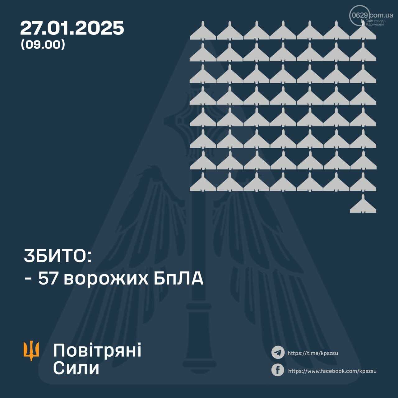 По состоянию на 09.00 подтверждено избиение 57 ударных БпЛА типа «Shahed» и беспилотников других типов в Киевской, Николаевской, Харьковской, Полтавской, Сумской, Днепропетровской, Хмельницкой, Житомирской, Винницкой и Ивано-Франковской областях.