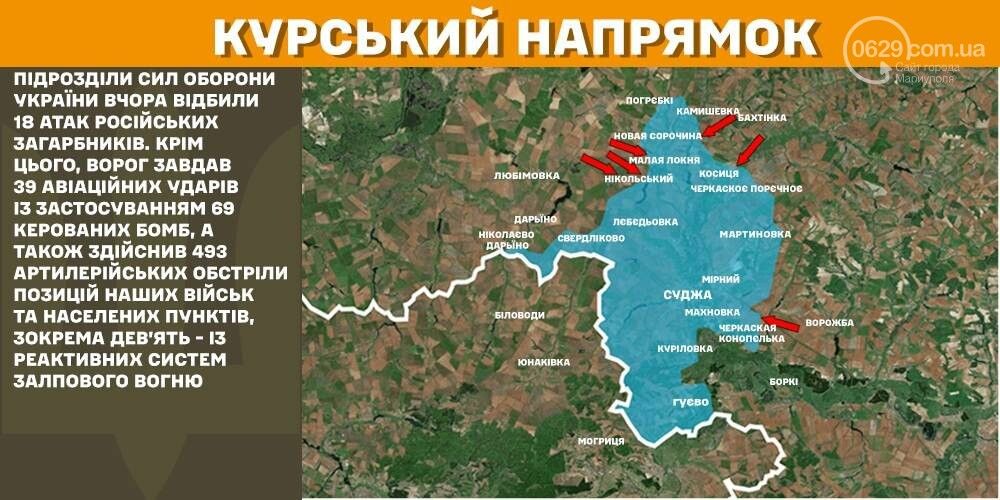 В операционной зоне на Курщине подразделения Сил обороны Украины вчера отразили 18 атак российских захватчиков. Кроме этого, враг нанес 39 авиационных ударов с применением 69 управляемых бомб, а также совершил 493 артиллерийских обстрела позиций наших войск и населенных пунктов, в том числе девять из реактивных систем залпового огня.