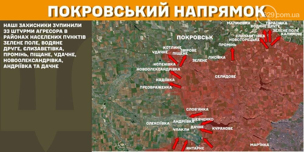 На Покровском направлении наши защитники остановили 33 штурма агрессора в районах населенных пунктов Зеленое Поле, Водяное Второе, Елизаветовка, Луч, Песчаное, Удачное, Новоалександровка, Андреевка и Дачное.