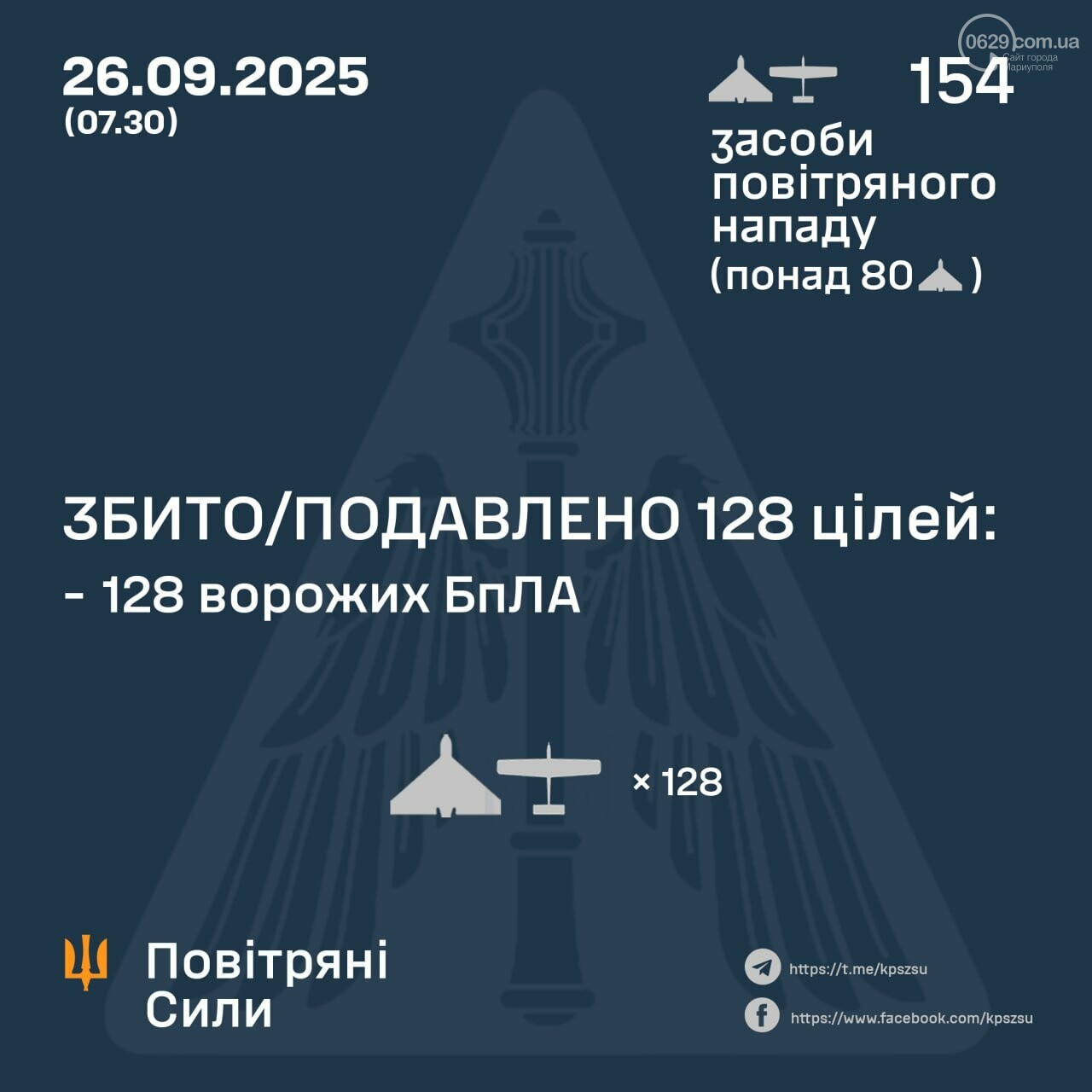 По предварительным данным, по состоянию на 07.30, противовоздушной обороной сбито/подавлено 128 враждебных БпЛА типа Shahed, Гербера и дронов других типов на севере, юге, востоке и центре страны.