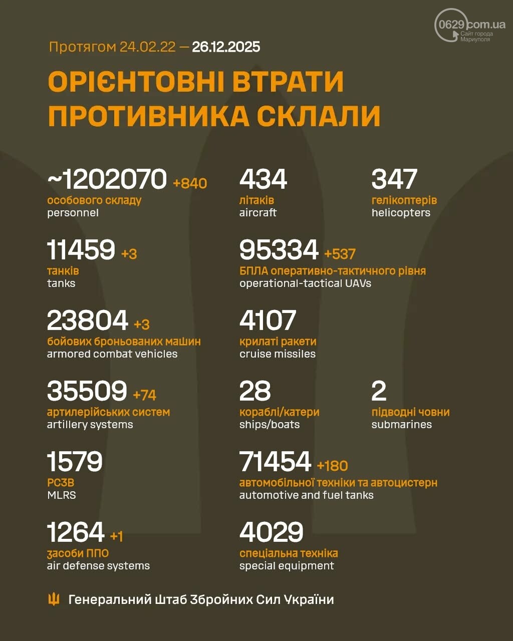 Сегодня 26 декабря. Продолжаются 1402 сутки полномасштабного российского вторжения.