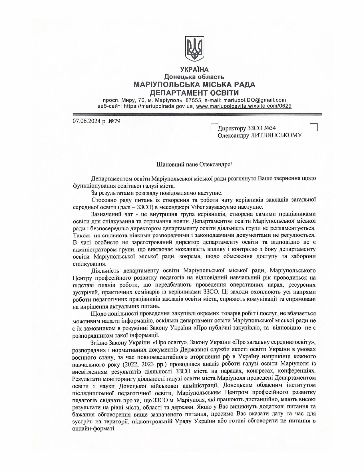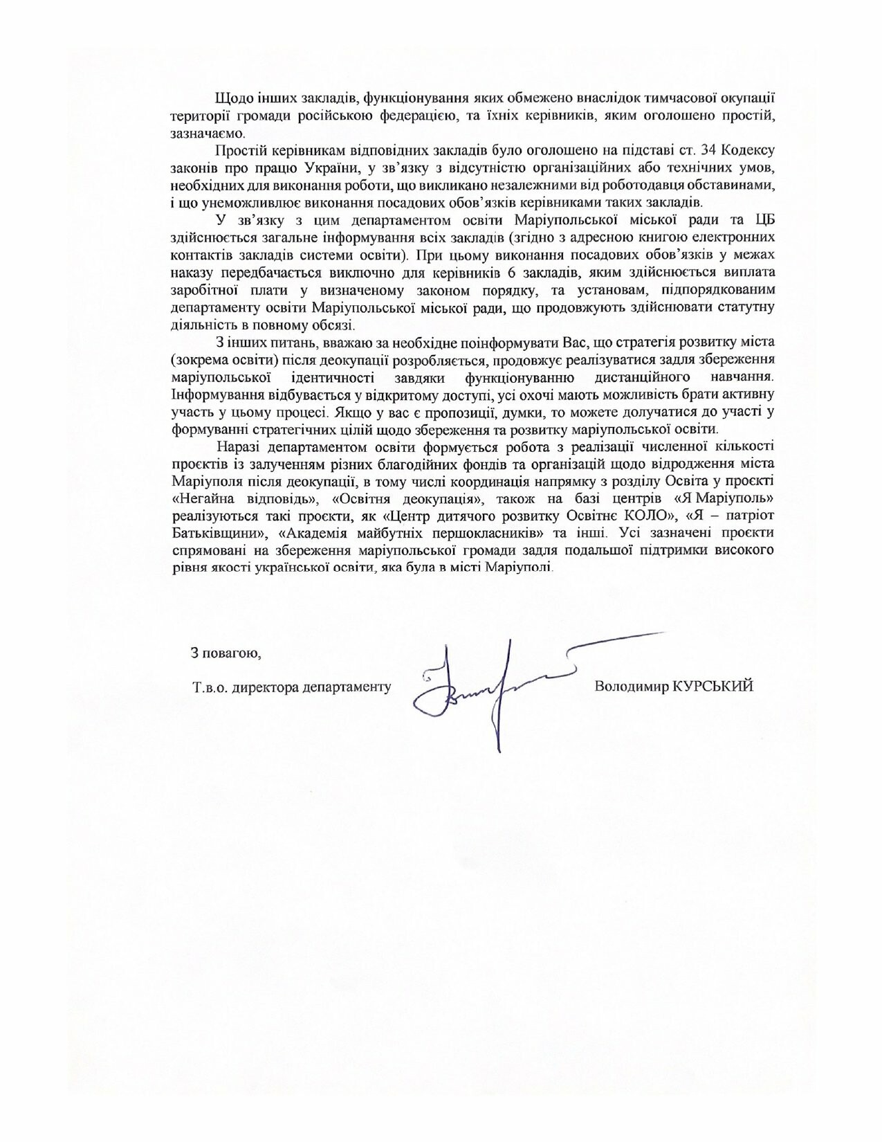 НАЧАЛО ИСТОРИИ ЗДЕСЬ: Как мариупольская власть закрыла рот директорам школ. Письмо Александра Литвинского.