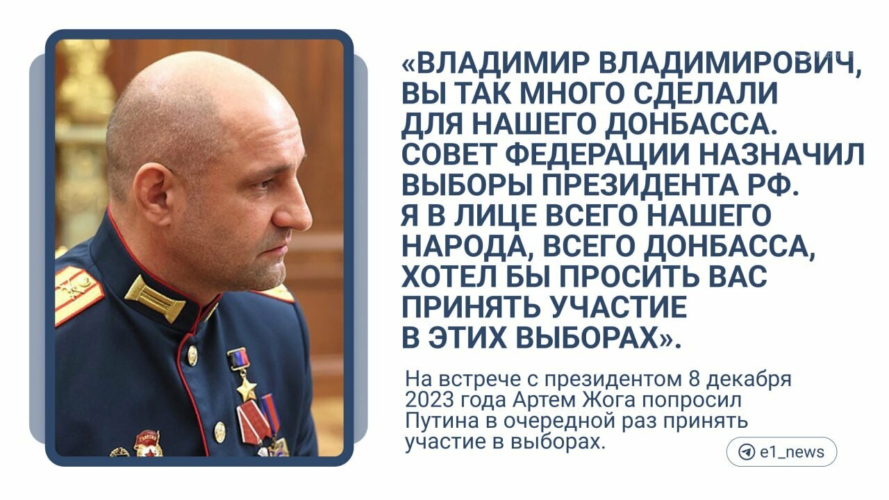 В декабре 2023 года Артем Жога на церемонии вручения медалей в Кремле публично попросил Владимира Путина снова пойти на президентские выборы, и тот согласился, а впоследствии стал сопредседателем его избирательного штаба. Весной 2024 года он поступил в программу по подготовке участников войны в Украине для госслужбы «Время героев», его наставником был глава администрации президента РФ Антон Вайно (человек, который вводил пропагандистские медиа и руководил работой пропагандистского телевидения «Мариуполь 24» после оккупации города.