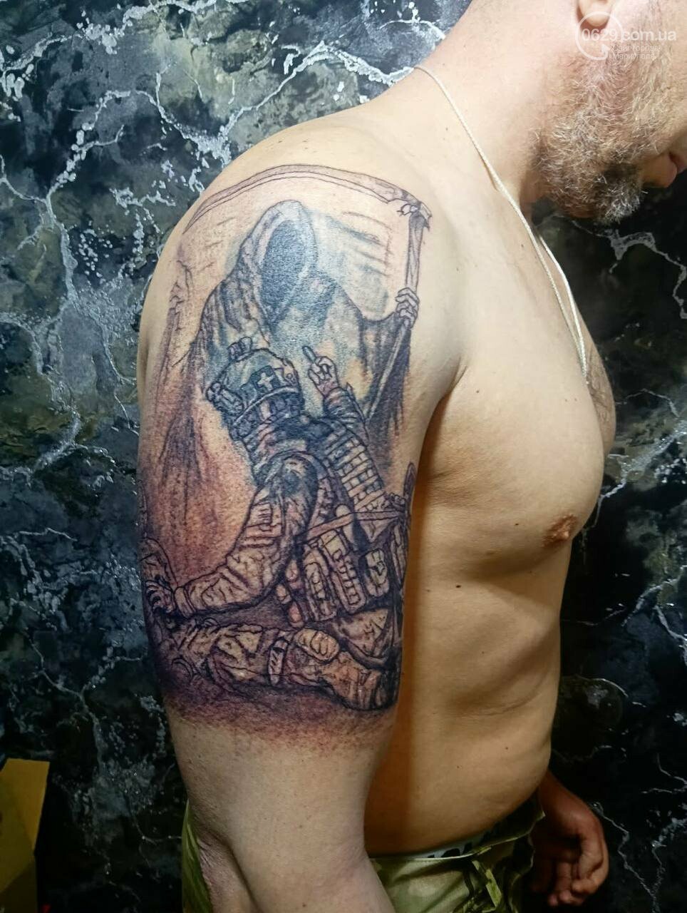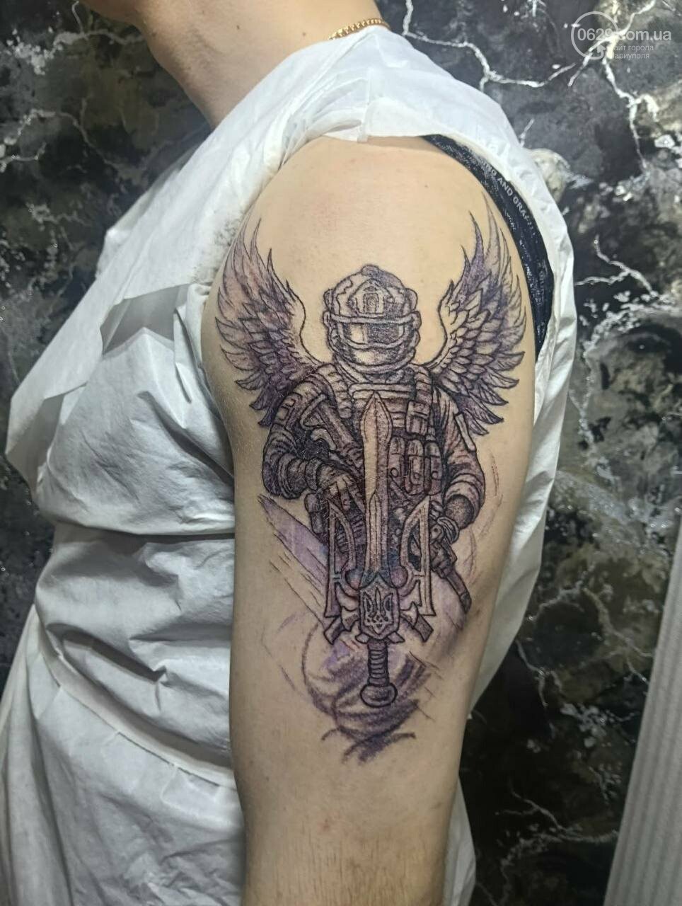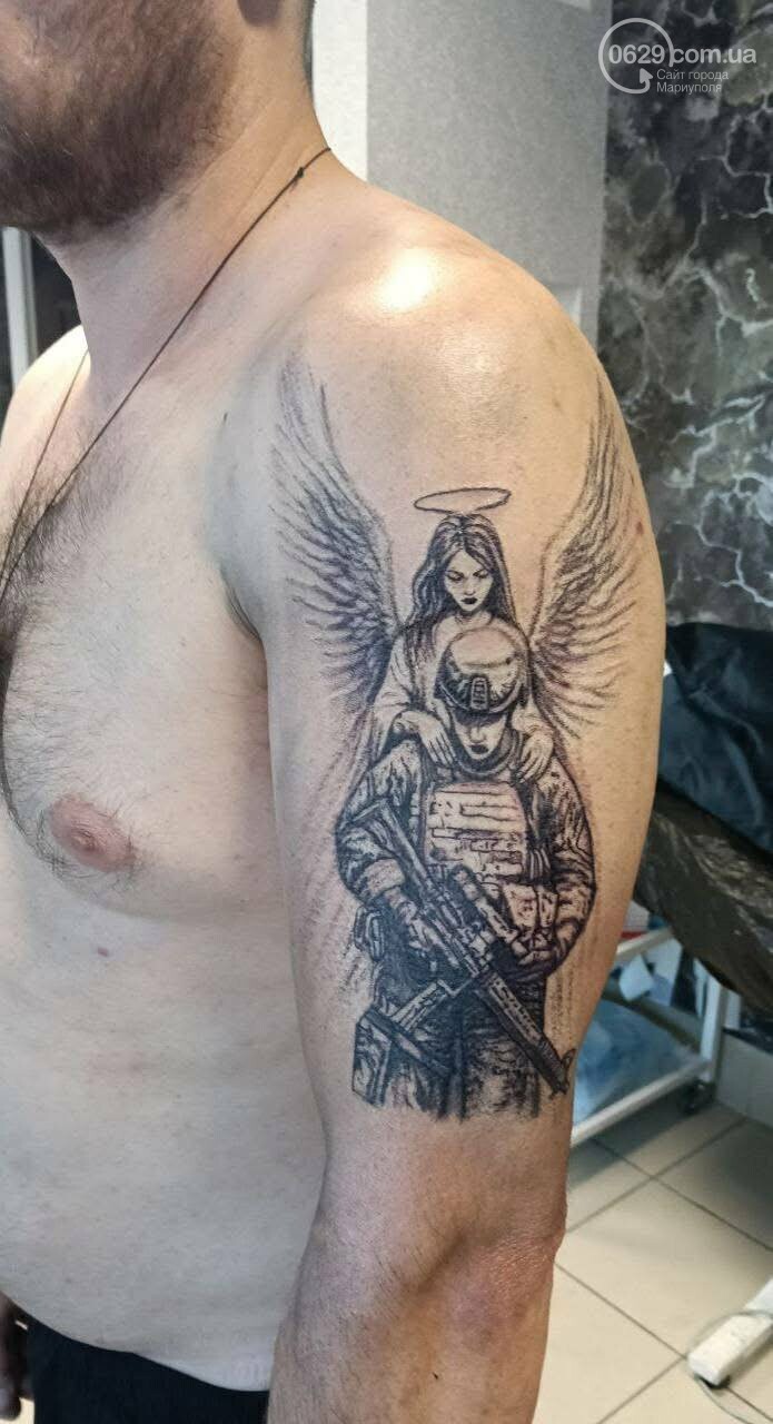 Например, недавно освобожденный из плена мариуполец Евгений Юрочкин перекрывал старую татуировку новым. На войне Юрочкин был парамедиком – человеком, спасающим других бойцов. Поэтому он набил медика на поле боя, жестом одного пальца отказывающего Смерти забрать раненого с собой.