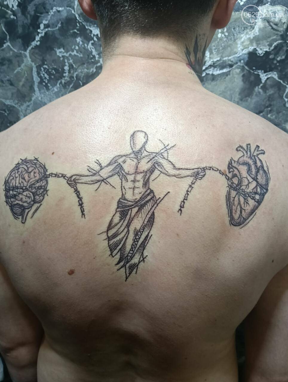 Другой освободившийся из плена парень набил на спине рисунок, который разрабатывал вместе с мастером с помощью чата GPT. Он хотел, чтобы было ясно видно сочетание разума и чувств, разнообразных мыслей и эмоций, которыми он жил все годы неволи.