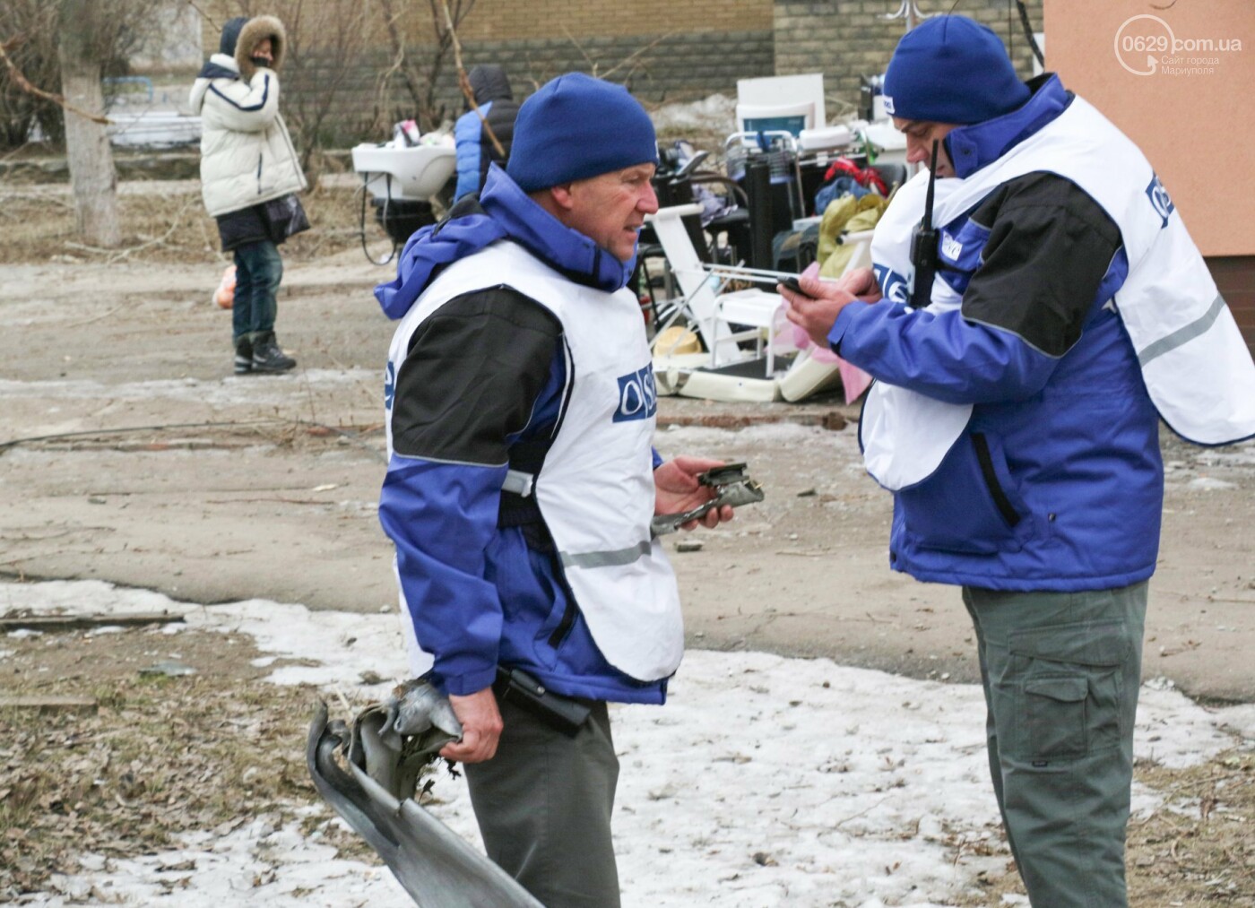 На месте трагедии заметили наблюдателей ОБСЕ, фиксировавших данные в местах попадания снарядов.