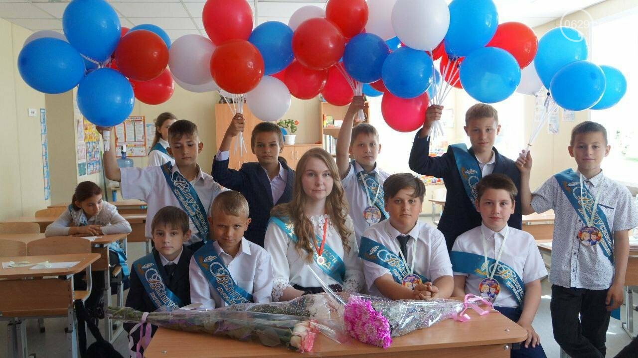 В других школах Мариуполя выпускные прошли в таком точно ключе. Российский гимн, русские флаги, шары в цветах русского флага.