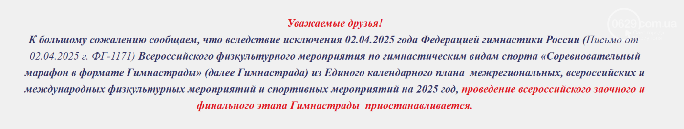Однако 2 апреля 2025 г. Федерация гимнастики России исключила Гимнастраду из календаря (письмо № ФГ-1171). После этого всероссийские этапы и финал отменили – марафон просто прекратили проводить.