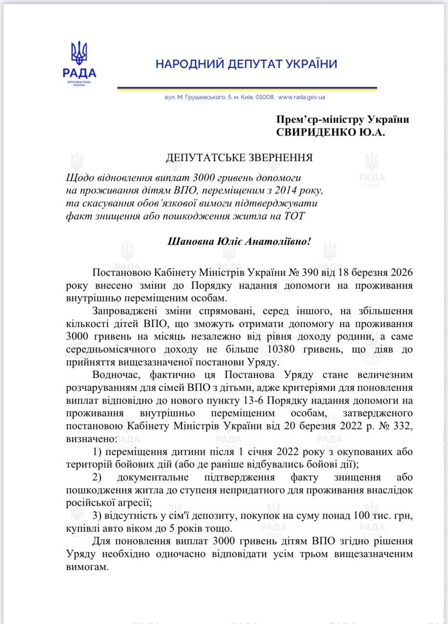 "Обратился к Премьер-министру с требованием возобновить выплаты 3000 грн всем детям ВПЛ, перемещенным с 2014 года, и отменить обязательное подтверждение факта уничтожения жилья на ТОТ", — отметил он.