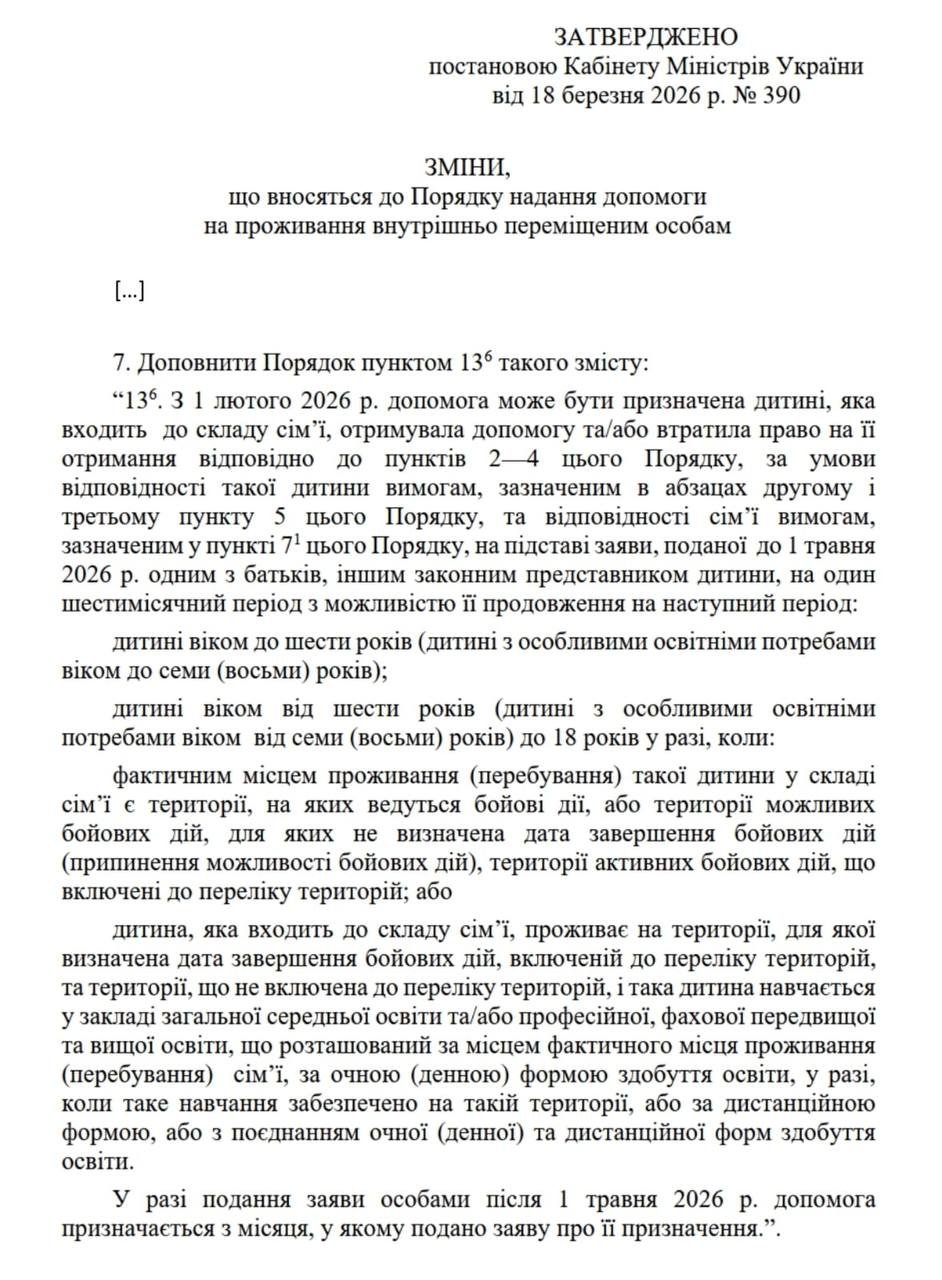В настоящее время, согласно правительственному постановлению №390 от 18 марта, для получения помощи нужно одновременно удовлетворять нескольким критериям. В частности, ребенок должен быть перемещен после 1 января 2022 года, жилье семьи уничтожено или непригодно для проживания, а также отсутствуют значительные финансовые активы.