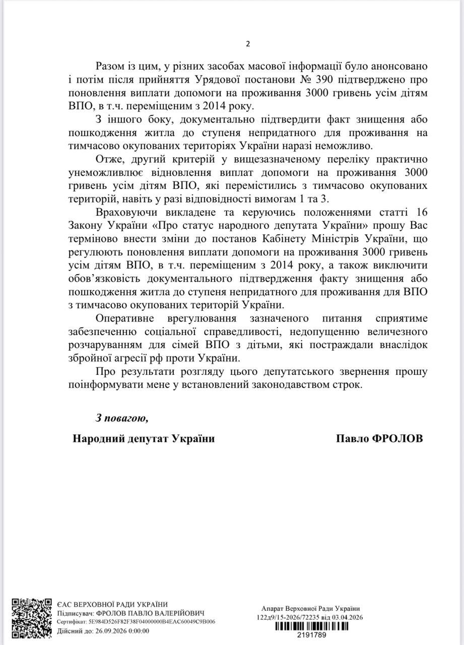 Народный депутат Павел Фролов призвал правительство пересмотреть критерии предоставления выплат детям внутренне перемещенных лиц (ВПЛ), предупредив, что действующие условия могут лишить помощи десятки тысяч семей.