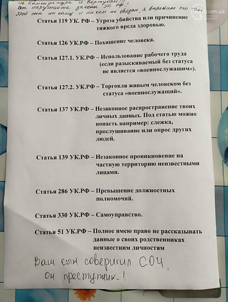 А ниже рукой дописано: "Ваш сын СОЧ, он сбежал из армии, поэтому он преступник".