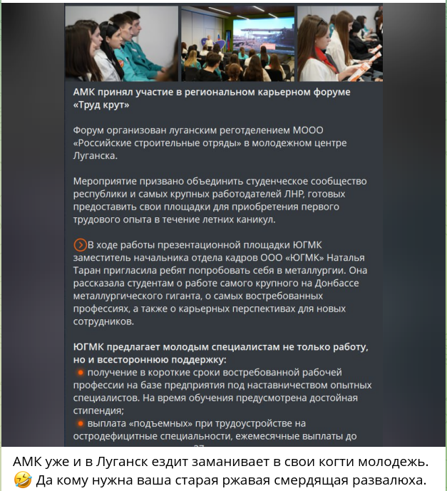Для справки: До начала оккупации Луганщины в 2014 году Алчевский меткомбинат входил в активы донецкой компании "Индустриальный союз Донбасса" (ИСД) олигарха Сергея Таруты. В 2005—2008 годах ИСД проводило программу модернизации предприятия, в рамках которой построены и пущены в эксплуатацию 2 машины непрерывного литья заготовок, установка «печь-ковш», вакууматор, конвертерный цех, реконструировались доменные печи.