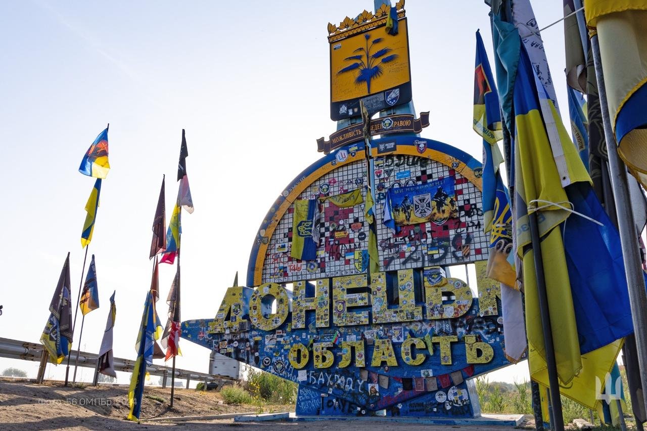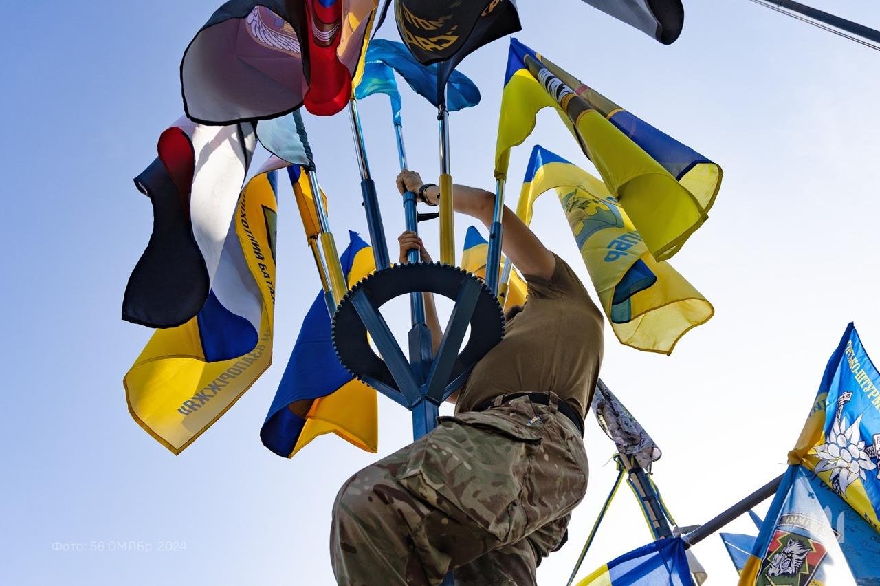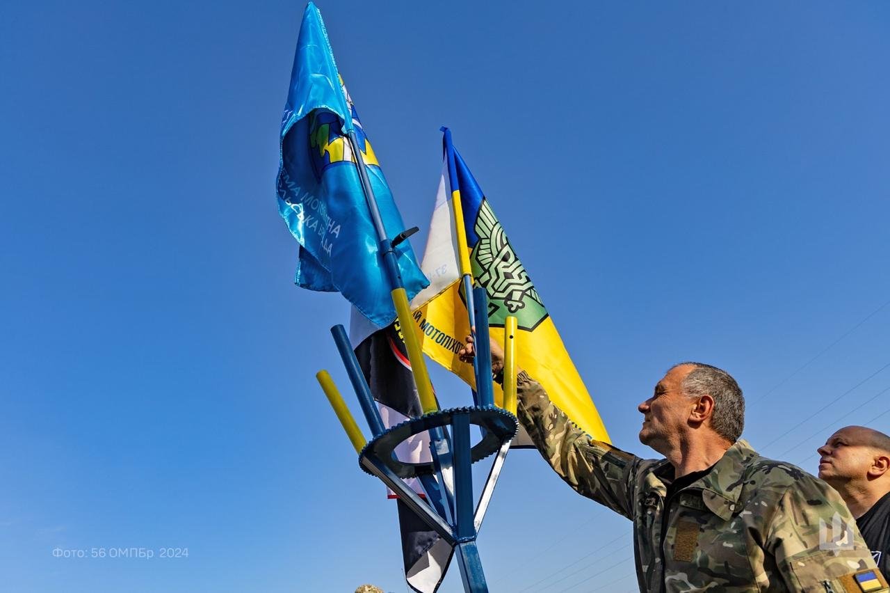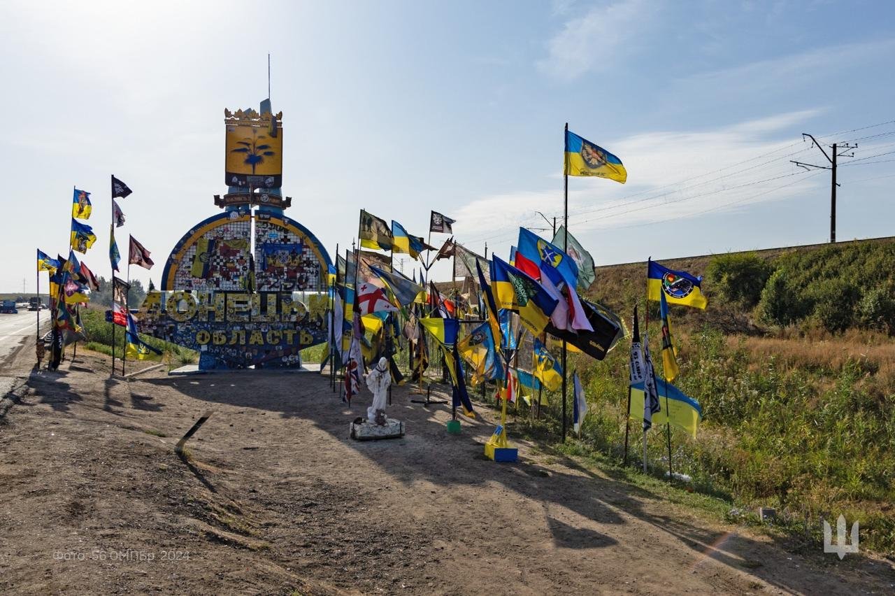 Накануне Дня государственного флага Украины возле стелы на въезде в Донецкую область военные установили знамена 56 отдельной мотопехотной Мариупольской бригады и подразделений, входящих в ее состав.