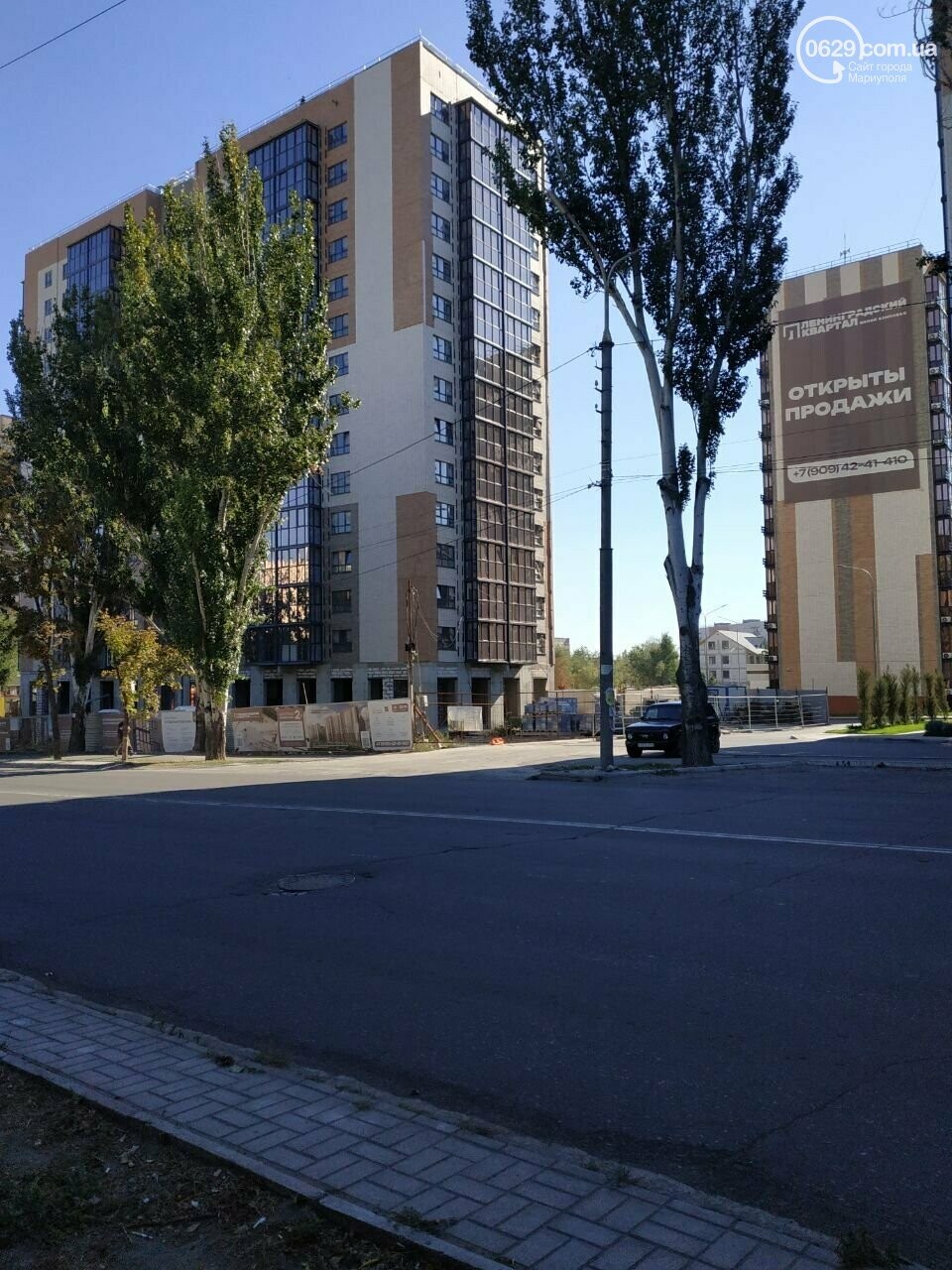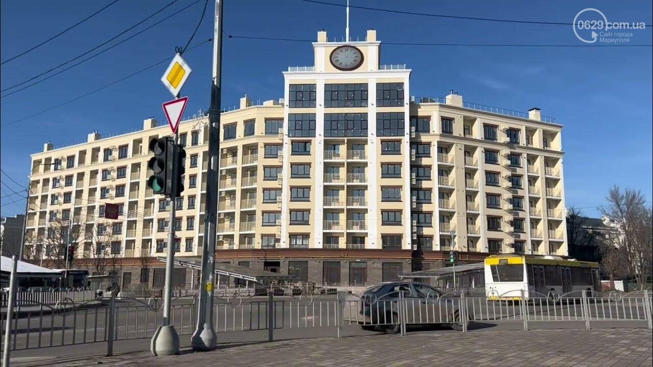Дом с часами в Мариуполе. оккупанты рекламируют его выгодное расположение — "всего за 15 минут пешком до моря". Предыдущее здание, пострадавшее во время российской блокады – снесли. На его месте был построен новый под ипотеку. Владельцы выживших квартир дома не могут больше там жить.