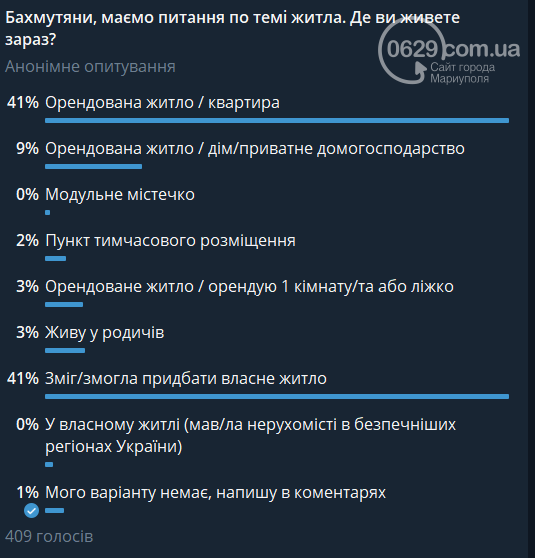 Киев, Днепр, Харьков, Львов, Кривой Рог и другие – эти города стали временным домом для переселенцев из Бахмута. Собственное жилье для большинства остается недостижимым, особенно для людей постарше, часто не имеющих никакого дохода, кроме пенсии, которая не может покрыть базовые потребности, не говоря уже о даже аренде жилья. Чтобы узнать текущую ситуацию с жильем у бахмутян, мы опросили свою аудиторию.
