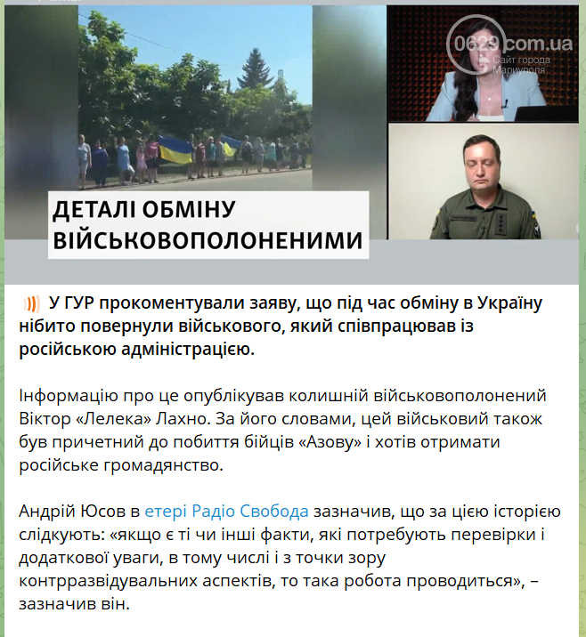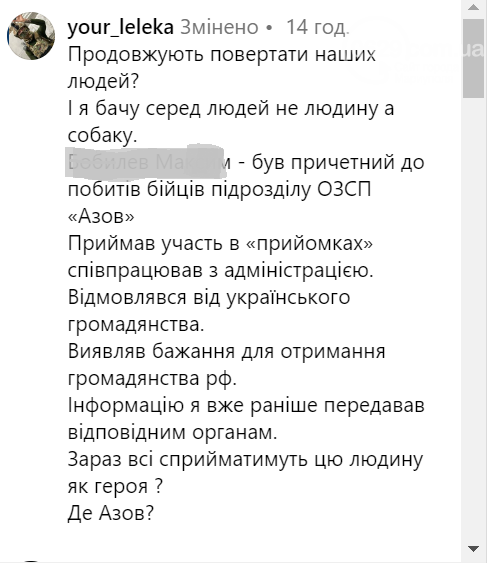 "Продолжают возвращать наших людей? И я вижу среди людей не человека а собаку. Б.М. (пока не доказан факт сотрудничества, мы не называем имя и фамилию подозреваемого человека — прим. 0629) был причастен к избиениям бойцов подразделения ОЗСП "Азов". Принимал участие в "приемках" сотрудничал с администрацией. Отказывался от украинского гражданства. Изъявлял желание для получения гражданства рф", — сообщил Виктор Лахно.