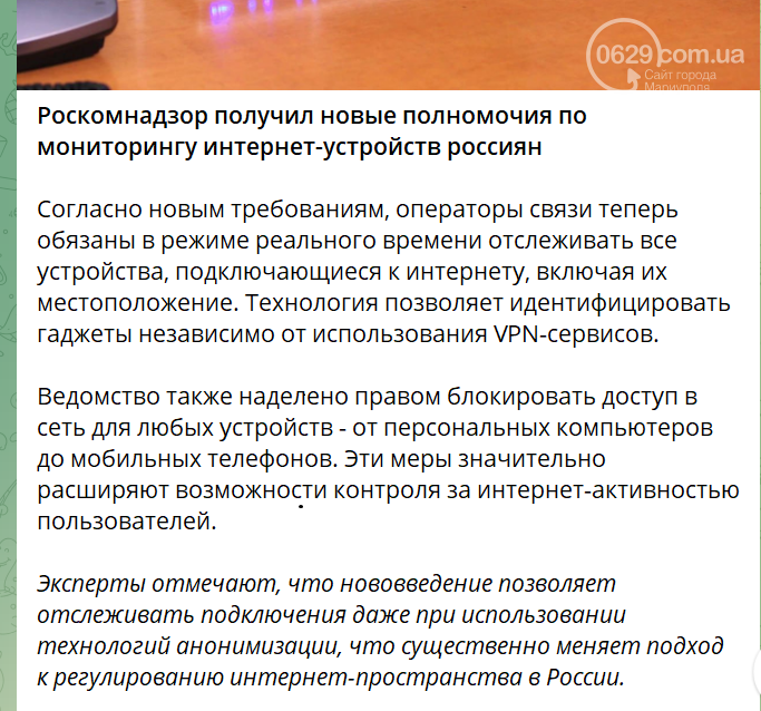Такие сообщения распространяются на оккупированных территориях Украины. Людей предупреждают, что VPN их больше не спасут, а «всевидящее око» Кремля будет следить за всеми в режиме 24/7, сообщает Relocated media cluster.