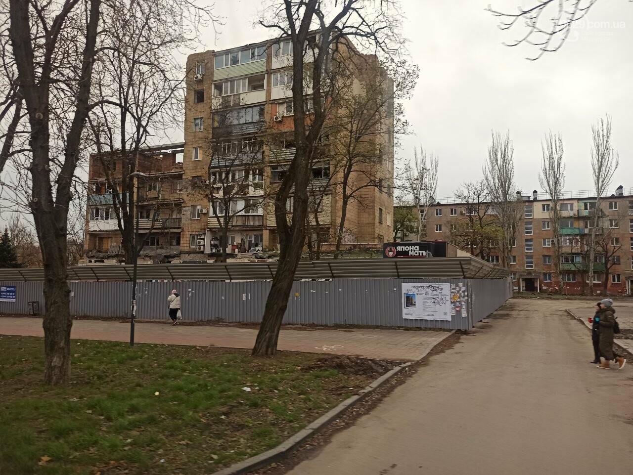Багатоповерхівка на проспекті Миру, навпроти площі Свободи, втратила декілька верхніх поверхів під час російського бомбардування Маріуполя.