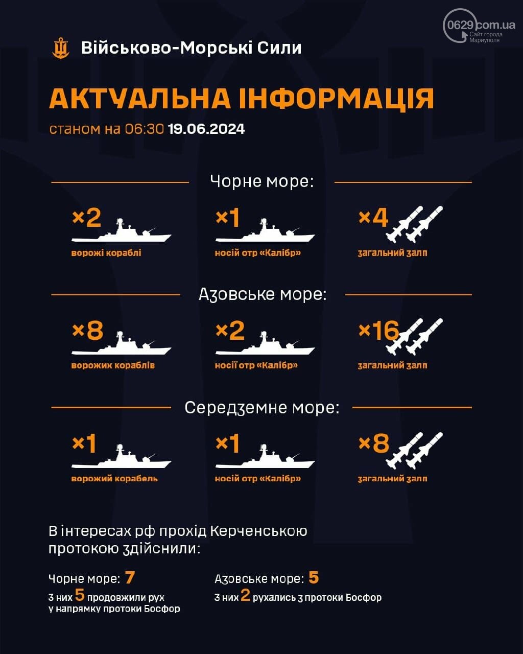 По состоянию на 06:30 19 июня в Черном море 2 вражеских корабля, 1 из которых является носителем крылатых ракет "Калибр" общим залпом до 4 ракет.