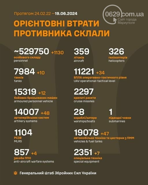 Общие боевые потери противника с 24.02.22 по 19.06.24 ориентировочно составили около 529750 (+1130) человек.