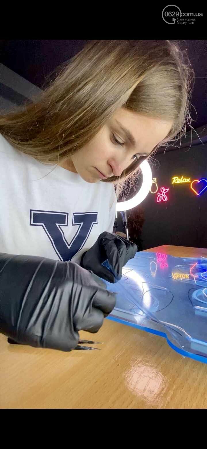 Але хоч і придбали його вже в Одесі, перший грант отримали ще у Маріуполі, коли запропонували свою ідею для грантової програми для розвитку підприємств Донеччини. Ми ще тоді нічого не робили з неоном: я займалася оформленням свят, але хотілося ще якусь нішу знайти, щоб міг працювати чоловік.