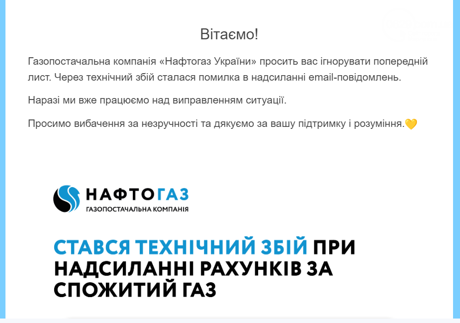 "Газоснабжающая компания "Нафтогаз Украины" просит вас игнорировать предыдущее письмо. Из-за технического сбоя произошла ошибка в отправке email-сообщений.