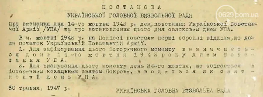 «В 1947 году, в пятилетие деятельности УПА, вышло постановление Украинского главного освободительного совета (УГОС) О признании дня 14 октября 1942 года Днем восстания Украинской повстанческой армии и об установлении этого дня праздничным днем УПА», — утверждает Леся Бондарук, региональный представитель Института национальной памяти Украины на Волыни.