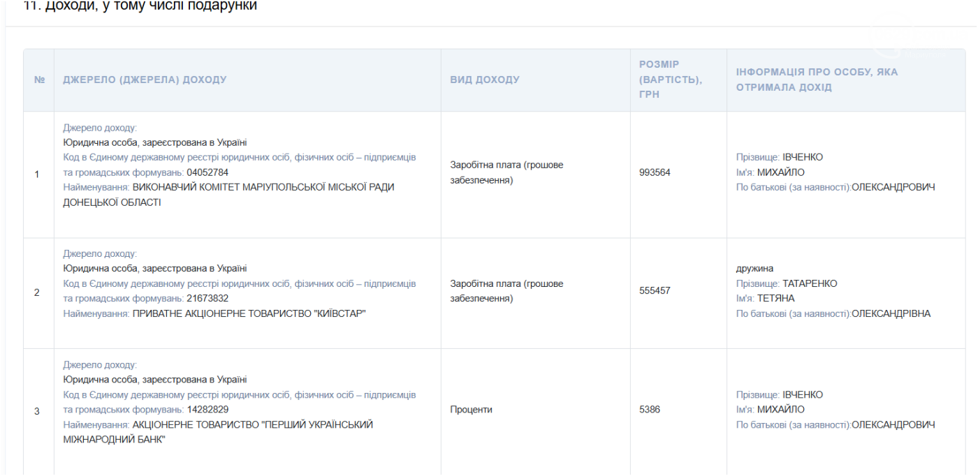 В 2024 году Михаил Ивченко задекларировал 987179 грн заработной платы в исполнительном комитете Мариупольского городского совета. В 2025 году эта сумма составила 918 968 грн . Таким образом, годовой доход должностного лица уменьшился примерно на 68 тысяч гривен.