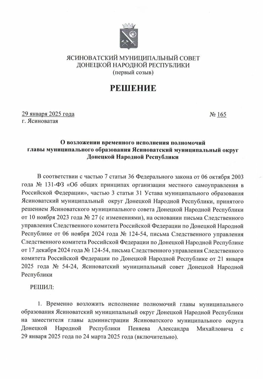 По решению российского следственного комитета, временно полномочия главы оккупационной администрации Ясиноватой до 24 марта 2025 поручили выполнять заместителю Пеняеву.