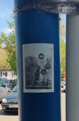 Сегодня, 8 мая, в Мариуполе активисты распространили листовки, на которых изображен солдат с флагом Украины, установленным над рейхстагом, а также флаги других бывших республик СССР.
