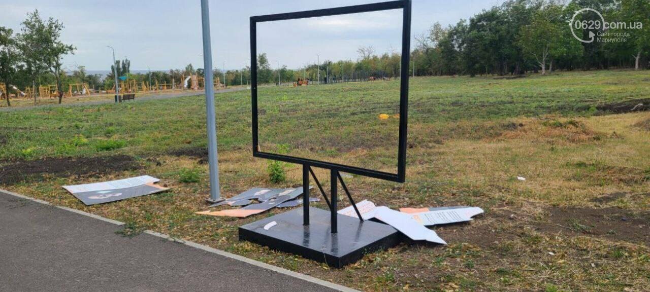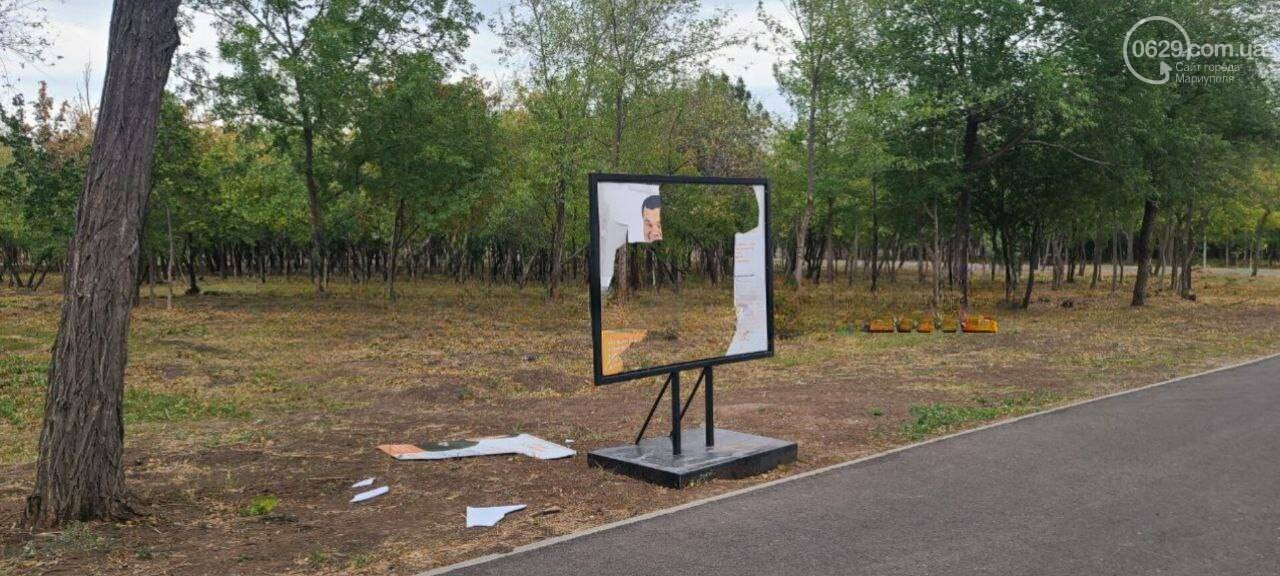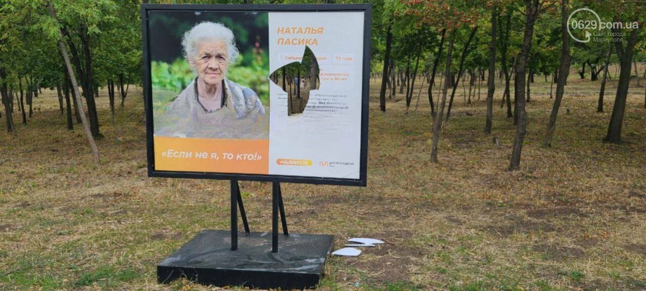 Во временно оккупированном Мариуполе неизвестные разбили плакаты, на которых были изображены российские волонтеры.