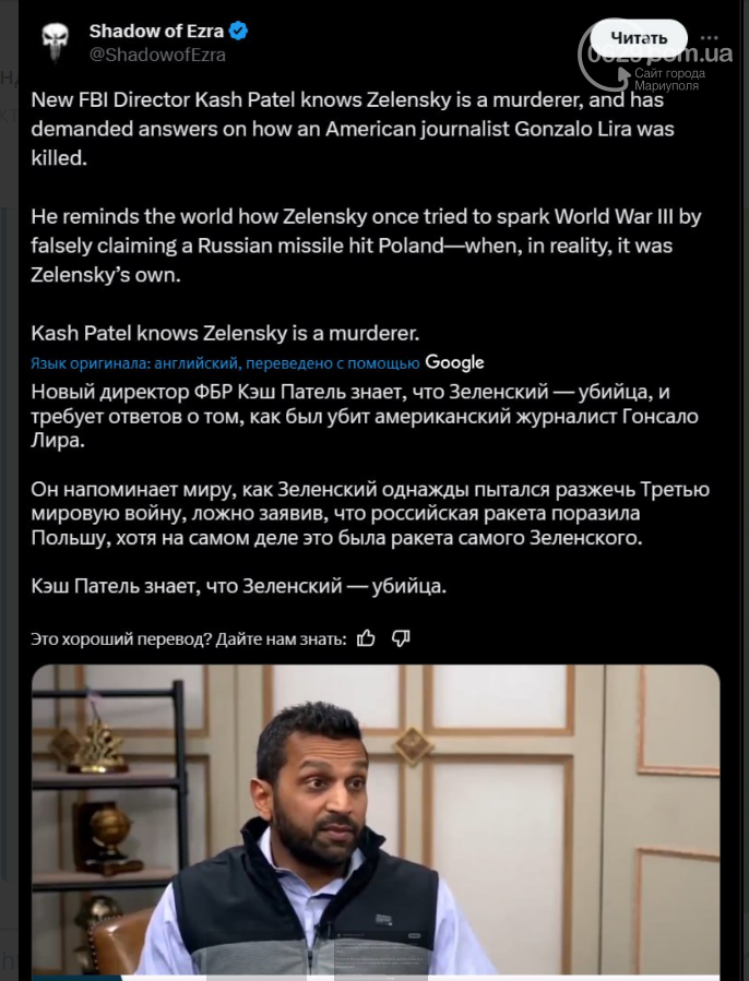 Позже в сети стали распространять сообщения, что новый директор ФБР Каш Пател также в курсе того, что Зеленский якобы убил американского журналиста, и требует ответов на вопрос, как именно погиб Гонасало Лира.