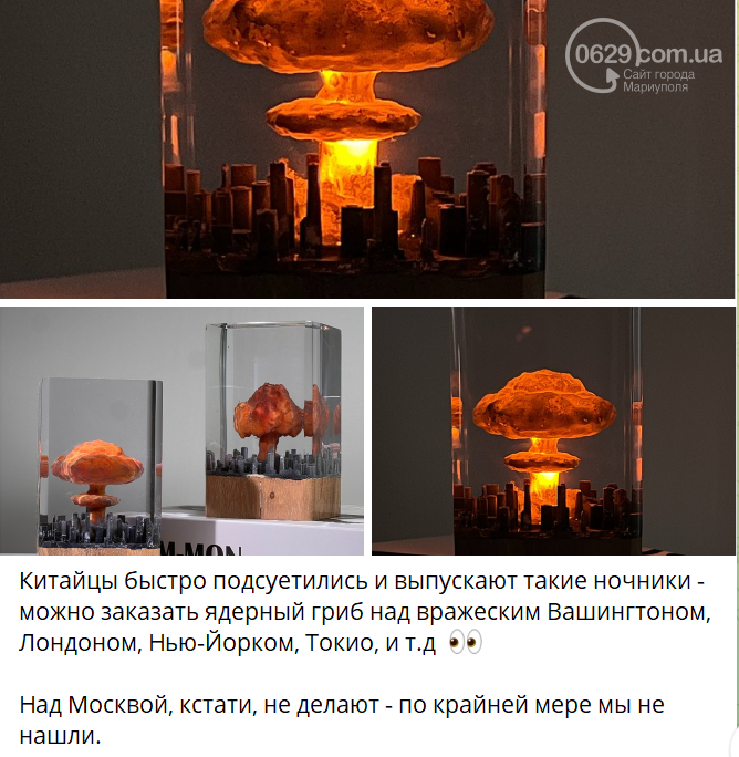 Некоторые телеграмм-каналы, например «Мариуполь наш», снова поднимали тему ядерных угроз странам ЕС. Они показали ночник в виде ядерного взрыва над большим городом и стали говорить, что это разработал Китай, чтобы намекнуть «западным партнерам» о возможной ядерной угрозе.