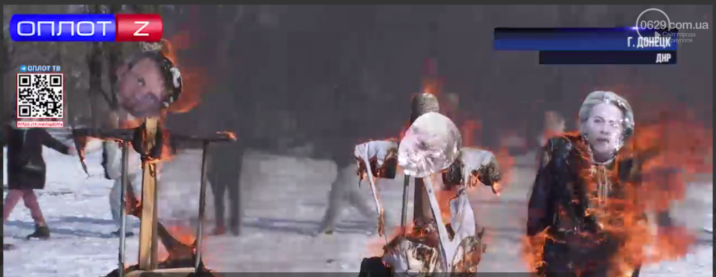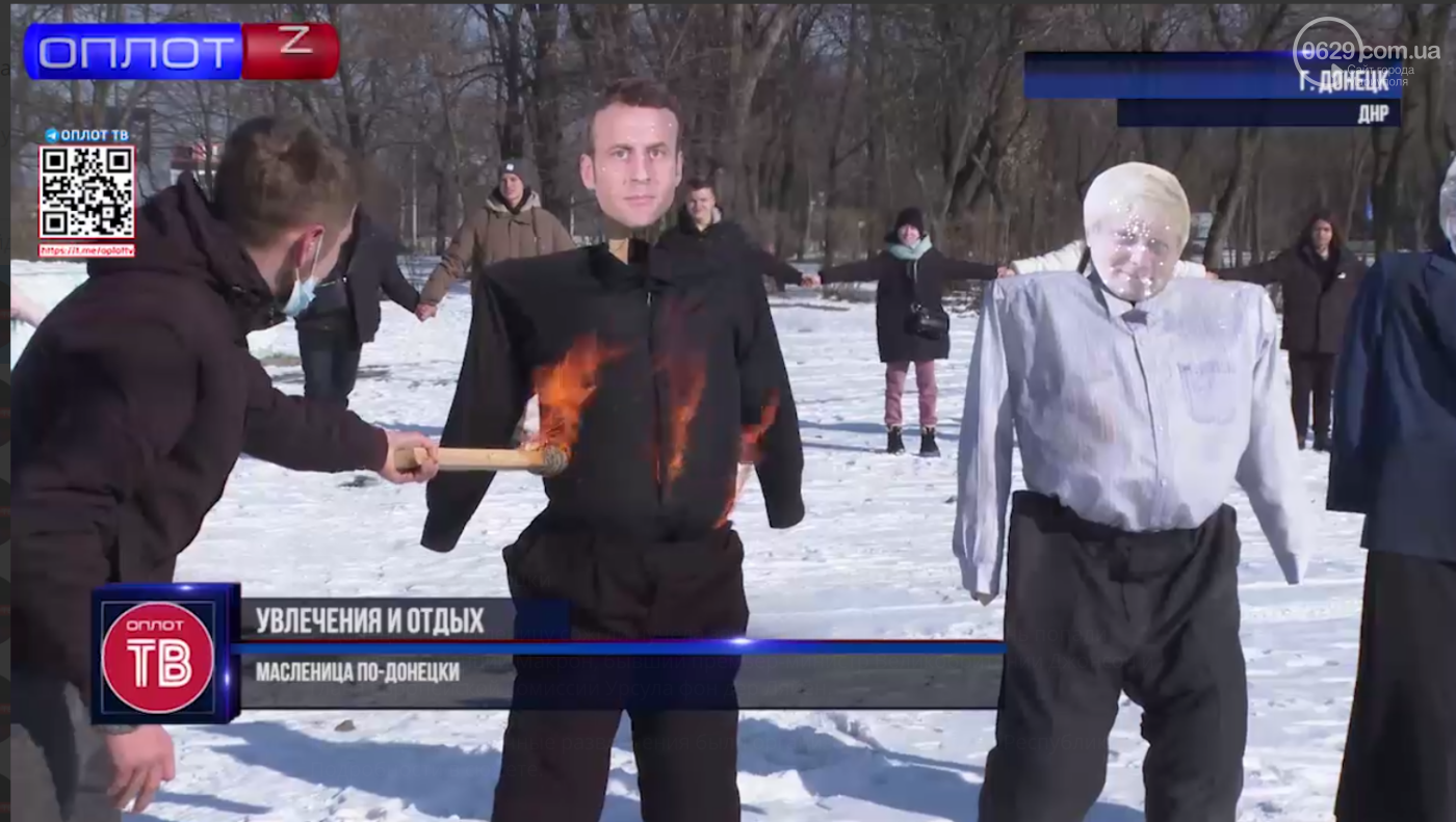 На Масленицу российские пропагандисты на всех телеканалах Донбасса показывали, как в оккупированном Донецке сжигали фигуры Эмманюэля Макрона, президента Франции, Бориса Джонсона, бывшего премьера Великобритании (видимо, фамилию нового премьера этой пропагандисты еще не изучили) и У.