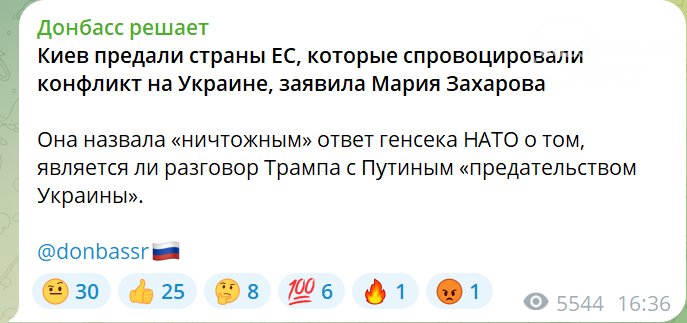 Кроме того, телеграмма-каналы в оккупации распространяли заявление МИД РФ о том, что это не США, а страны ЕС изменили Украине. Но встреча лидеров стран Европы, собравшихся 2 марта в Лондоне для разработки собственного плана действий и собственного предложения по мирному соглашению, свидетельствует как раз об обратном.