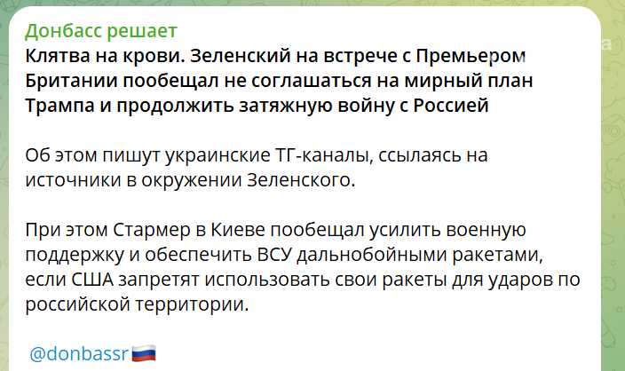 Телеграмма-канал выпустил сразу несколько сообщений на эту тему. Пропагандисты пишут о «клятве на крови», которую якобы дал Зеленский Стармеру, что ни при каких условиях не согласится на «мирный план» Трампа. Источник, на который ссылаются российские пропагандисты, – неназванные украинские телеграмм-каналы.
