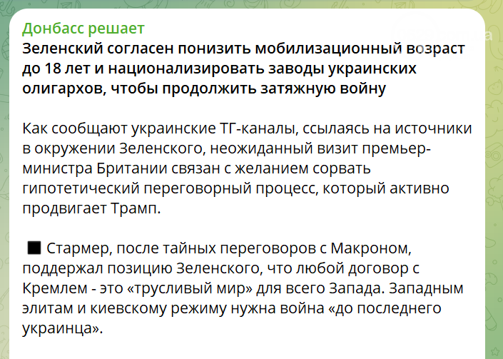 Со ссылкой на анонимные украинские телеграмм-каналы, российские пропагандисты сообщают, что визит премьер-министра Великобритании Кира Стармера в Киев преследовал цель сорвать «мирный процесс» Трампа.