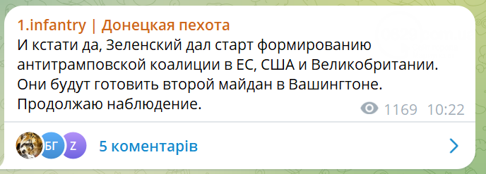 Пропагандисты сообщают, что Зеленский начал создавать антитрамповскую коалицию, объединяя определенные силы в США, а также ЕС и Великобританию. И что эта антитрамповская коалиция готовит Майдан в Вашингтоне.