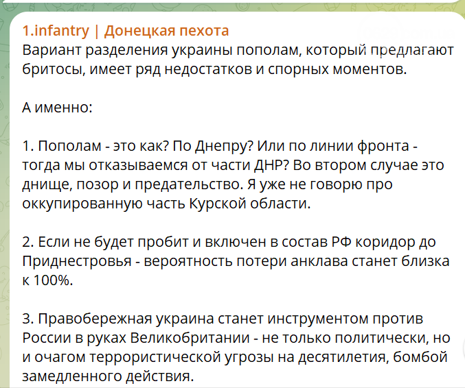 Автор телеграмм-канала «Донецкая пехота» анализирует этот фейковый сюжет и выражает недовольство, потому что считает, что любая часть Украины, если ее не захватить и не покорить, будет постоянной террористической угрозой для РФ на десятилетие.