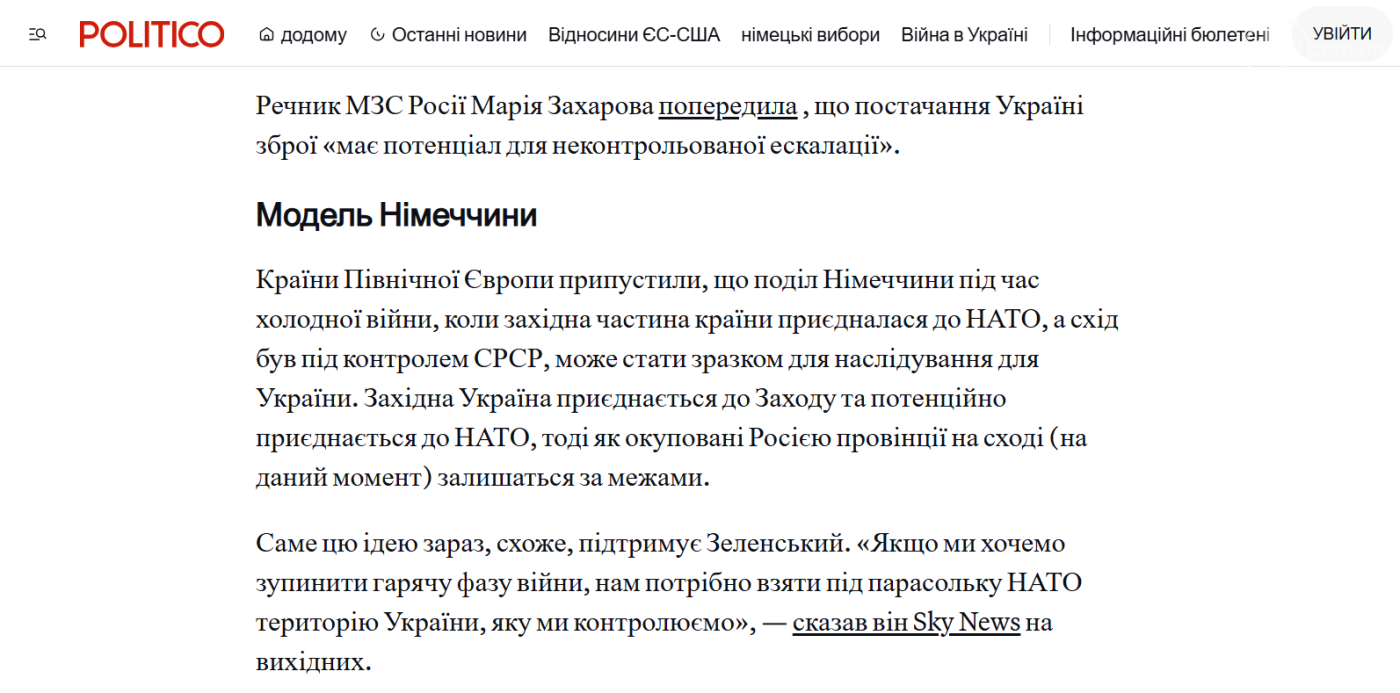 Опровержение . В статье Politico действительно идет речь о «немецком сценарии» мирного урегулирования войны России против Украины. Но там обсуждается не разделение Украины пополам, как кому-то очень хочется, а модель пошагового вступления Украины в НАТО частями: сначала той частью, которая контролируется украинским государством, а после дипломатического урегулирования – и другой части, которая сейчас временно оккупирована Российской Федерацией.