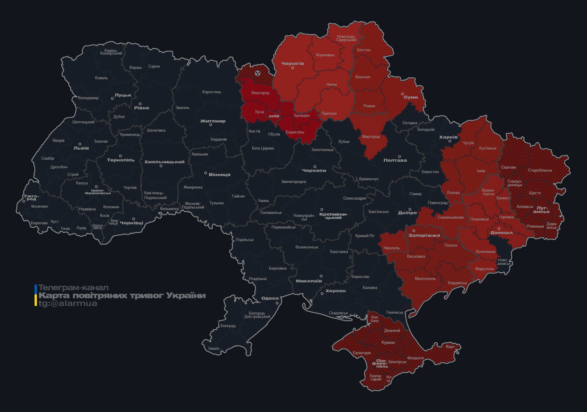По состоянию на 01:45 карта воздушных тревог имеет такой вид. Как можно увидеть, сигнал продолжается в Киевской, Черниговской, Сумской, Полтавской, Харьковской, Днепропетровской, Запорожской и Донецкой областях.